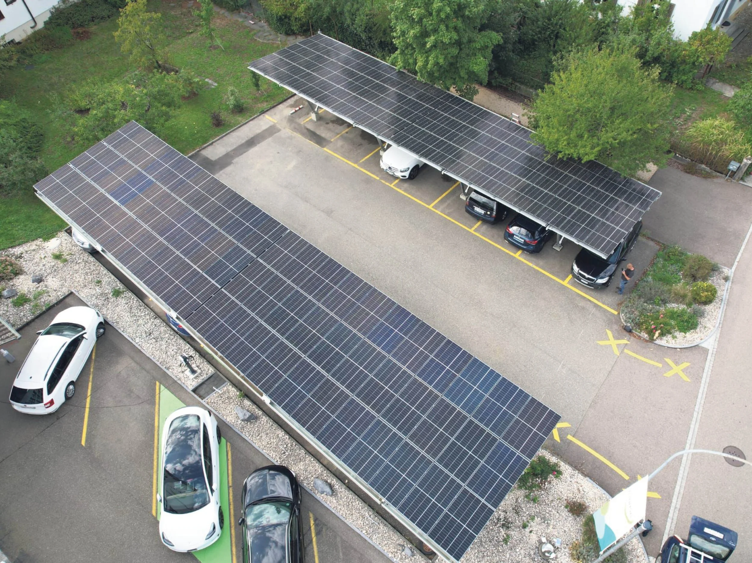 In Sisseln haben wir ein wegweisendes Solarcarportprojekt umgesetzt, bei dem insgesamt 120 Solarmodule auf den Carport-Strukturen installiert wurden. Die Gesamtleistung dieses Projekts beträgt beeindruckende 51,6 Kilowattpeak (kWp), und es bietet Platz für 17 Fahrzeuge, die dank der Solarenergie unter den Carports geparkt werden können.